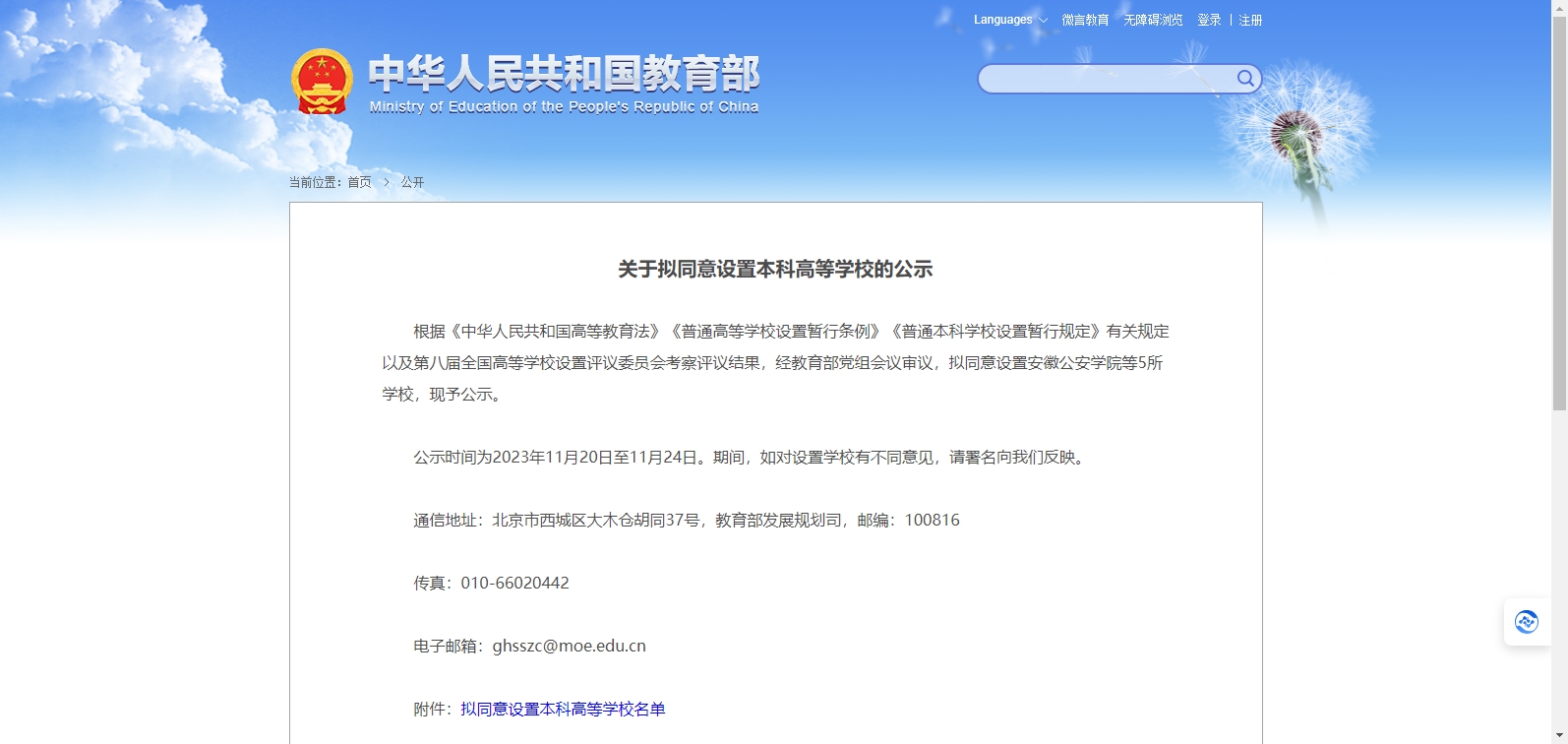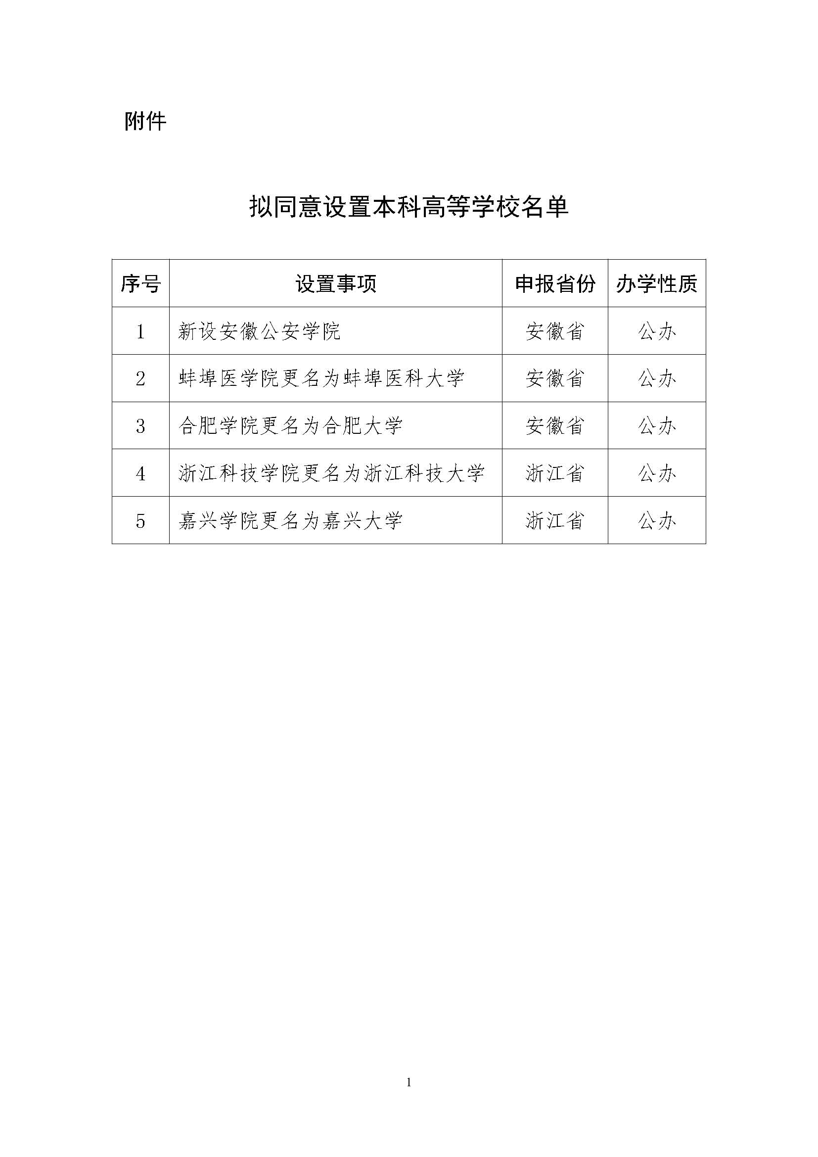教育部發(fā)布《關(guān)于擬同意設(shè)置本科高等學(xué)校的公示》。公示指出,根據(jù)《中華人民共和國(guó)高等教育法》《普通高等學(xué)校設(shè)置暫行條例》《普通本科學(xué)校設(shè)置暫行規(guī)定》有關(guān)規(guī)定以及第八屆全國(guó)高等學(xué)校設(shè)置評(píng)議委員會(huì)考察評(píng)議結(jié)果,經(jīng)教育部黨組會(huì)議審議,擬同意設(shè)置安徽公安學(xué)院等5所學(xué)校,現(xiàn)予公示。公示時(shí)間為2023年11月20日至11月24日。