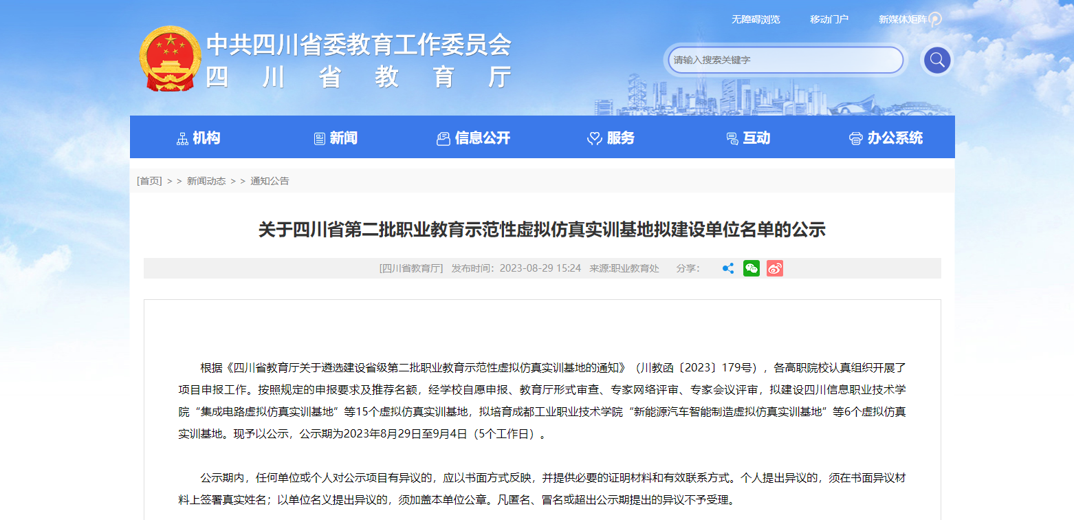 近日,四川省教育廳根據(jù)《四川省教育廳關(guān)于遴選建設(shè)省級第二批職業(yè)教育示范性虛擬仿真實訓(xùn)基地的通知》(川教函〔2023〕179號),公布了第二批職業(yè)教育示范性虛擬仿真實訓(xùn)基地擬建設(shè)單位名單,擬建設(shè)四川信息......
