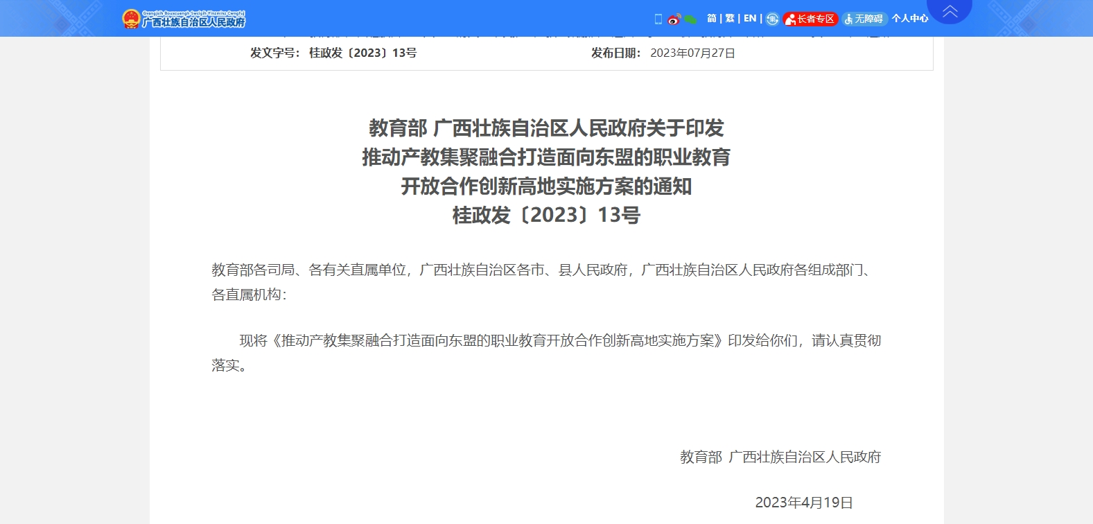 教育部、廣西壯族自治區(qū)人民政府聯(lián)合印發(fā)了《推動產(chǎn)教集聚融合打造面向東盟的職業(yè)教育開放合作創(chuàng)新高地實施方案》