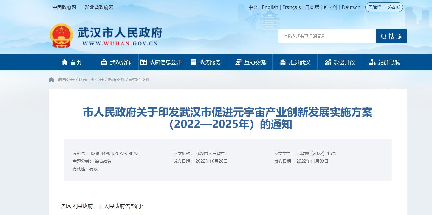 各區(qū)人民政府,市人民政府各部門: 經(jīng)研究,現(xiàn)將《武漢市促進(jìn)元宇宙產(chǎn)業(yè)創(chuàng)新發(fā)展實(shí)施方案(2022—2025年)》印發(fā)給你們,請(qǐng)認(rèn)真組織落實(shí)。 武漢市人民政府 2022......