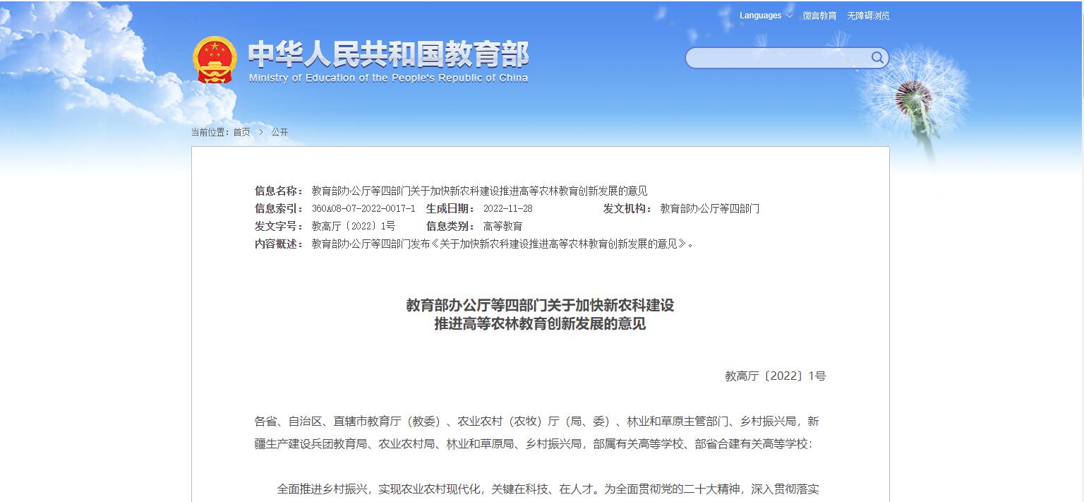 教育部辦公廳等四部門關于加快新農科建設推進高等農林教育創(chuàng)新發(fā)展的意見
