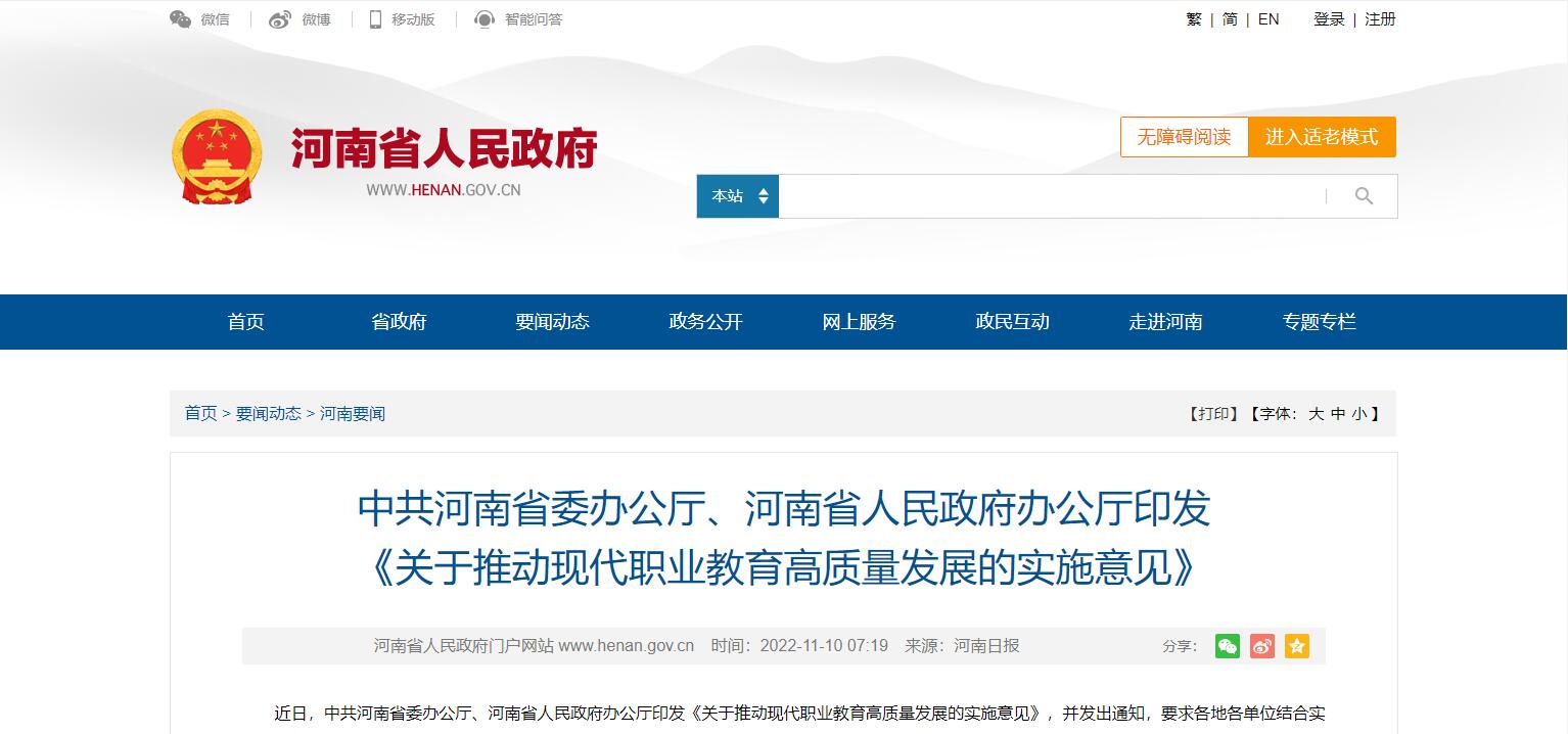 中共河南省委辦公廳、河南省人民政府辦公廳印發(fā) 《關于推動現(xiàn)代職業(yè)教育高質量發(fā)展的實施意見》