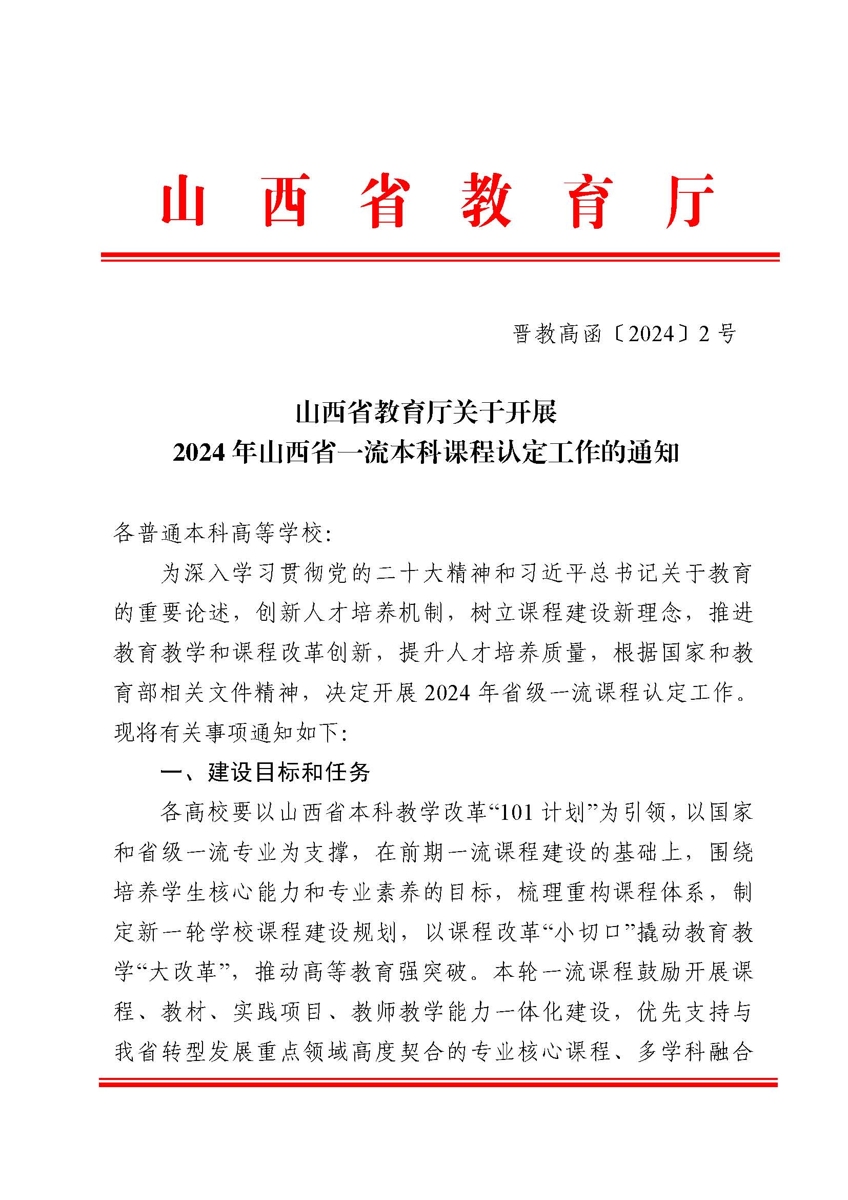 山西省教育廳發(fā)布關(guān)于開展 2024 年山西省一流本科課程認(rèn)定工作的通知